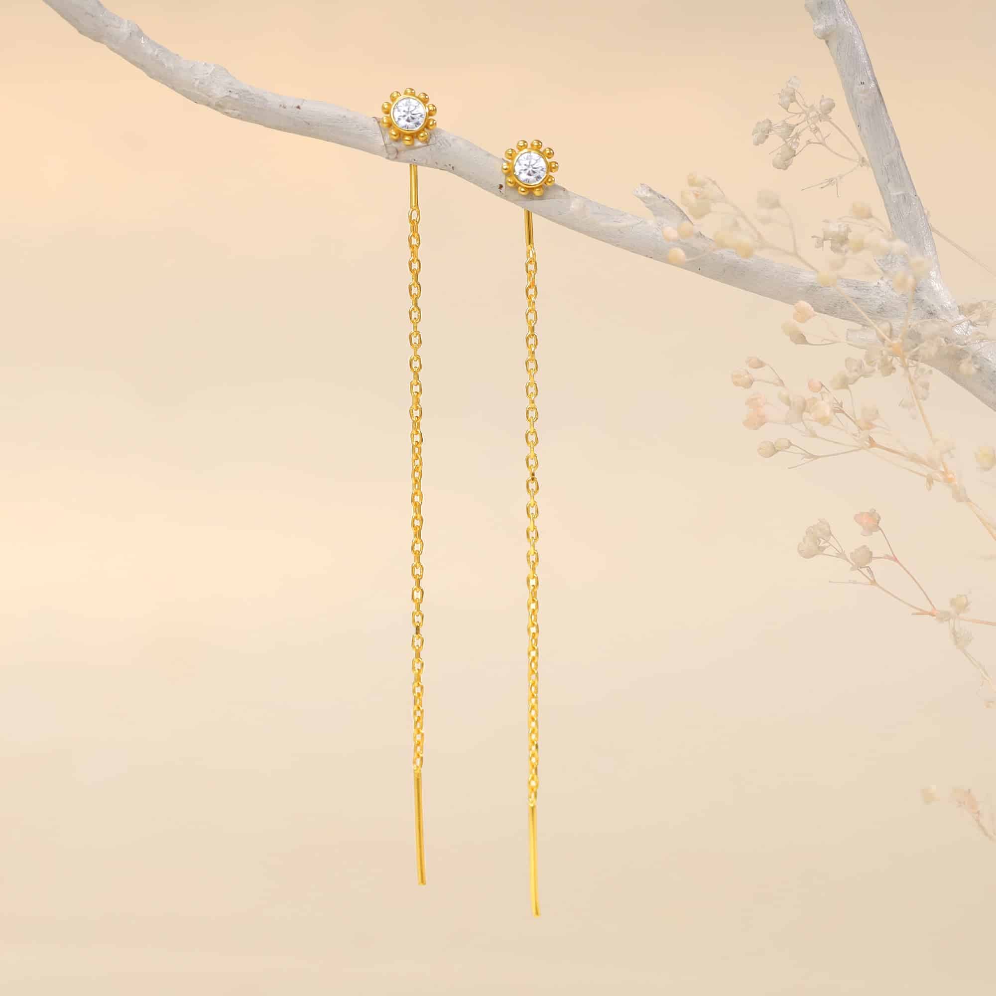 The Inspiration: A simple glam to make you look preppy and pretty. This fashionable pair cannot be missing from your earring collection. The Design: These golden earrings have a sui dhaga design featuring a circular zircon with a layer of beads around it. 925 Silver with Gold Plating Perfect for sensitive skin Earring Size: Height – 8.6 cm, Width – 0.6 cm Comes with the Nikrish Jewellery kit and authenticity certificate Content: Earrings Net Qty- 1 pair Styling Tip: Pair these with a maroon satin dress.