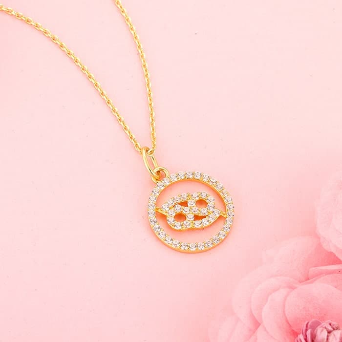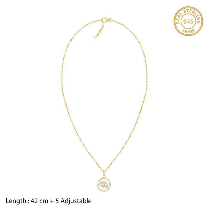 The Inspiration: The Golden Cancer Pendant With Link Chain is inspired by those born under this zodiac sign who nurture themselves and those around them. The Design: This golden pendant has the zircon-studded astronomical symbol of Cancer nestled within a round frame. 925 Silver with Gold Plating Perfect for sensitive skin Motif Height: 2.35 cm, Motif Width: 1.57 cm The necklace size is 43 cm and the adjustable chain is 4 cm Comes with the Nikrish Jewellery kit and authenticity certificate Content: Pendant with Chain Net Qty- 1 unit Styling Tip: Style this pendant with a rose-pink boho dress.