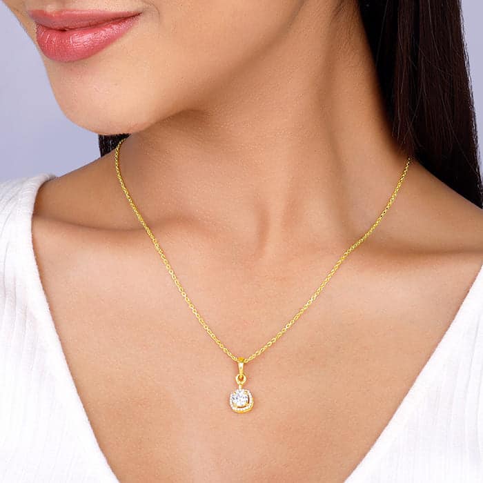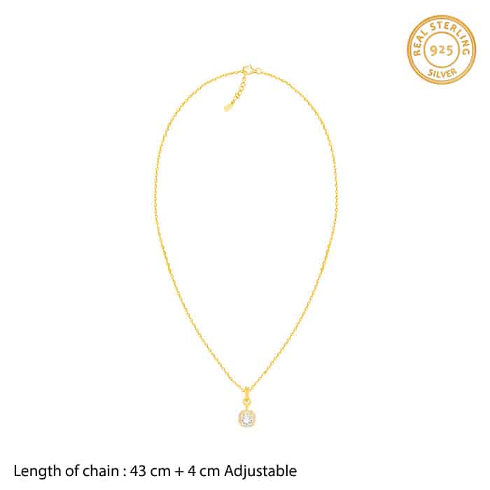 The Inspiration: This isn’t just a pendant. It’s your daily affirmation of your resilience and grace. The Design: This golden pendant has a circle motif studded with zircon and a big zircon placed at the centre. 925 Silver with Gold Plating Perfect for sensitive skin Length of chain: 43 cm + 4 cm Adjustable Motif Height: 2.1 cm, Width: 0.9 cm Comes with the Nikrish Jewellery kit and authenticity certificate Content: Pendant With Link Chain Net Qty- 1 unit Styling Tip: Style these to turn around a dull day.