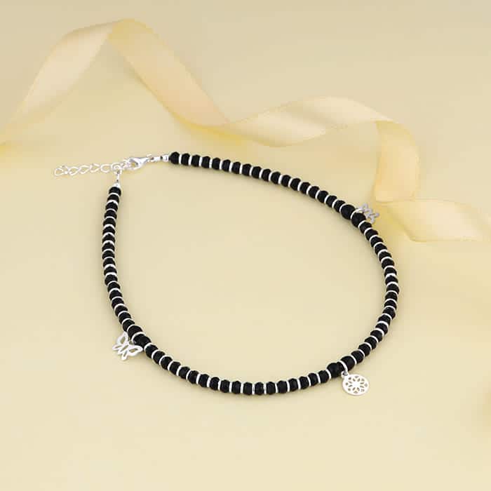 The Inspiration: Step into confidence and let the charm unfold with every stride. It’s not just an accessory, it’s a reflection of your pure and authentic self. The Design: This silver anklet features a black bead design with two butterflies and one flower charm. 925 Silver Perfect for sensitive skin Length of Chain: 26 cm + 3.5 cm Adjustable Motif Height: 1 cm, Width: 1 cm Comes with the Nikrish Jewellery kit and authenticity certificate Content: Anklet Net Qty- Single or pair, as chosen by you! Styling Tip: Wear this anklet with your favourite dress.